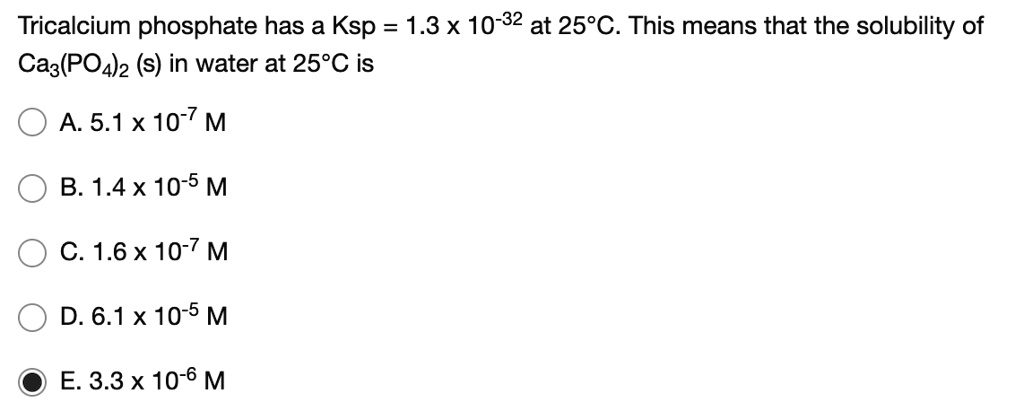 Solved Tricalcium Phosphate Has A Ksp 13x 10 32 At 258c This Means That The Solubility Of Ca3 Po4 2 S In Water At 25 C Is A 5 1x 10 7 M B 1 4x 10 5 M C 1 6x 10 7